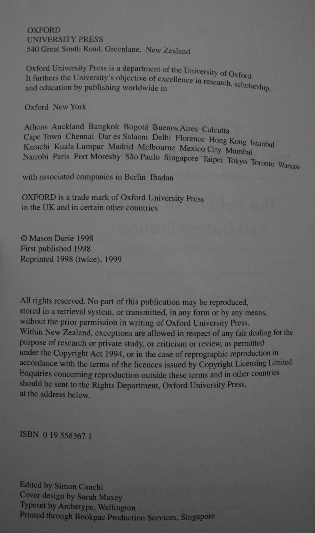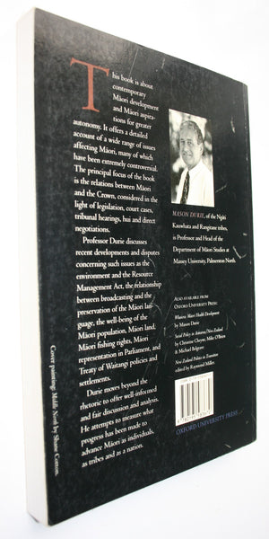 This book concerns contemporary development in Maori as well as this nation's aspirations for greater autonomy. Mason Durie offers a detailed account of Maori's legislative efforts at self-determination by highlighting the legal battles and conflicting attitudes between Maori and the Crown. Environmental management, issues related to the retention of language and culture, Maori representation in Parliament, and the Treaty of Waitangi are among the topics covered in this balanced and reasonable socio-political assessment.