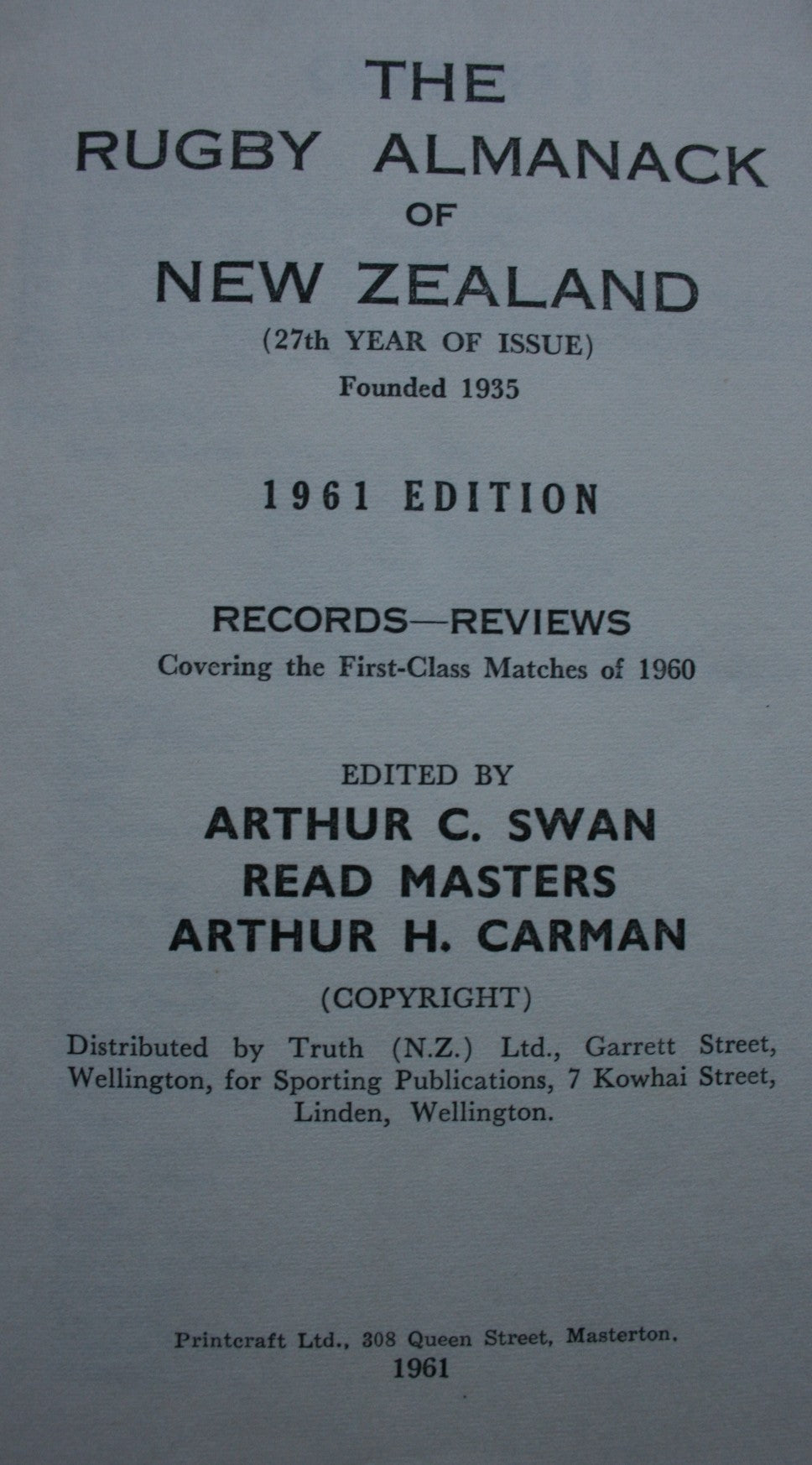 Publisher: Sporting Publications, Wellington, 1961 edition.